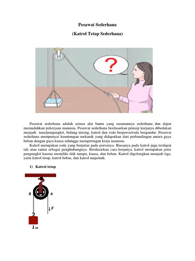 Pesawat sederhana pesawat sederhana adalah alat yang dapat katrol prinsip kerjanya sama dengan tuas, karena juga mempunyai titik tumpu, kuasa, dan beban. Keuntungan menggunakan pesawat sederhana ialah keuntungan mekanik. Roda berporos ,merupakan pesawat sederhana yang digunakan untuk memudahkan memindahkan suatu benda. Pesawat sederhana dapat dibedakan menjadi beberapa macam antaralain, tuas/pengungkit, katrol, roda, dan bidang miring. 4 pesawat yang terbentuk dari beberapa pesawat sederhana pesawat rumit pesawat yang 18 katrol bebas katrol yang posisinya selalu berubah karena tidak ditempatkan di tempat tertentu. Pesawat sederhana yaitu alat yang dipakai untuk mempermudah pekerjaan. Kuntungan dari pesawat sederhana yaitu. Pesawat sederhana dikelompokkan menjadi empat jenis yaitu tuas atau pengungkit, katrol, bidang miring, dan roda berporos. Tuas/pengungkit, katrol, bidang miring, dan roda berporos/ roda bergandar. Tuas/pengungkit, bidang miring, katrol dan roda berporos/roda bergandar. Katrol adalah pesawat sederhana berupa roda beralur yang dikelilingi oleh tali. Katrol (kerek) katrol merupakan roda yang dapat berputar pada porosnya yang berguna sebagai alat pengangkat atau penarik benda. Katrol terdiri atas katrol tetap dan katrol bebas.